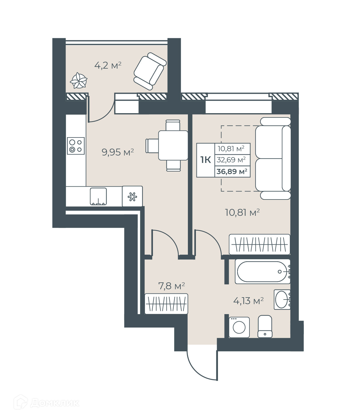 - Общая площадь: 36.89 м²